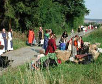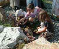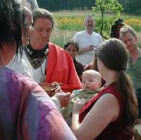 Es war einer der wenigen sonnigen und heißen Tage dieses Sommer. Drei Harfen verzauberten die Festgemein-schaft mit ihren Klängen. Die Quelle, eingefasst in große Quarzsteine, wurde von den anwesenden Kindern liebevoll mit Blumen geschmückt. Auch wurde jedem der Gäste ein Blümlein gereicht. Nach dem Eintreffen Aller reichten wir uns die Hände und der Kreis wurde geschlossen. In der Mitte die Quelle, zu ihrer Seite die Großeltern. Klein Florian, sonst immer ruhig und ausgeglichen, fühlte sich anfangs nicht sonderlich wohl. Er tat sein Unbehagen durch anhaltend tönende Unmutsäußerungen kund. Es lag an der Bauchtrage, aus der er eigentlich schon herausgewachsen war. Außer auf den Arm genommen zu werden, verlangte er noch nach seinem Taufrgewand, welches seine Mama ihm für diesen besonderen Tag hergerichtet hatte: ein kleines grünes Gewand aus Leinen mit einem langen Bernstein behangenen Zipfel. Nun war es auch viel besser und schöner. So entspannt konnten er und Sebastian dann auch den Segen der sieben Feen entgegennehmen.