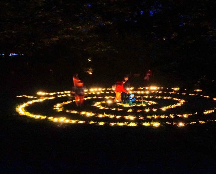 Und dann völlig unerwartet gab der Weg die Sicht auf die grosse Lichterspirale frei, die jetzt im Dunkeln ihre ganze Schönheit entfaltete.
